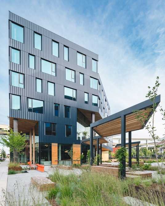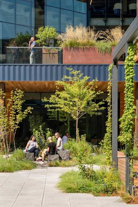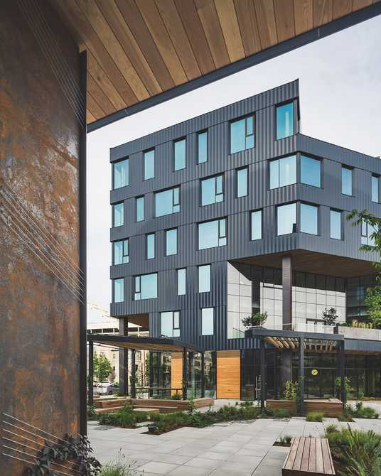 Project Description: The developer Project^ came to Hacker Architects with the goal of revitalizing an under-utilized industrial sector of Portland’s Willamette River corridor. The design story became an intersection of city and nature where the boundary between inside and out was blurred to create more humane workspaces for the buildings’ tenants. Amenities include: an at grade courtyard packed with native plants, a lush indoor living room, a bike lounge, high parks, and sky parks. An industrial palette of corrugated steel, weathering steel, and salvaged Douglas fir serve as the backdrop for the cultural and natural regrowth of the site.